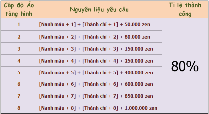 - Áo Tàng Hình được kết hợp thông qua NPC Goblin tại Noria theo công thức.