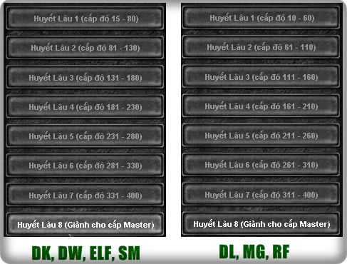- Huyết Lâu bao gồm 8 tầng tùy theo các cấp độ của nhân vật.
